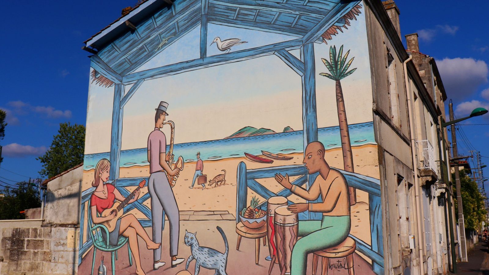Ne vous sentez vous pas attiré irrésistiblement par cette peinture ? Cela est dû à la parfaite utilisation de la totalité de la surface du mur et à la perspective. Le spectateur est aspiré avec les musiciens... En quelques instants le voici sur la plage. On rêve de tropiques ! Ce mur peint réunit plusieurs des passions de Loustal, dessinateur et illustrateur français :
