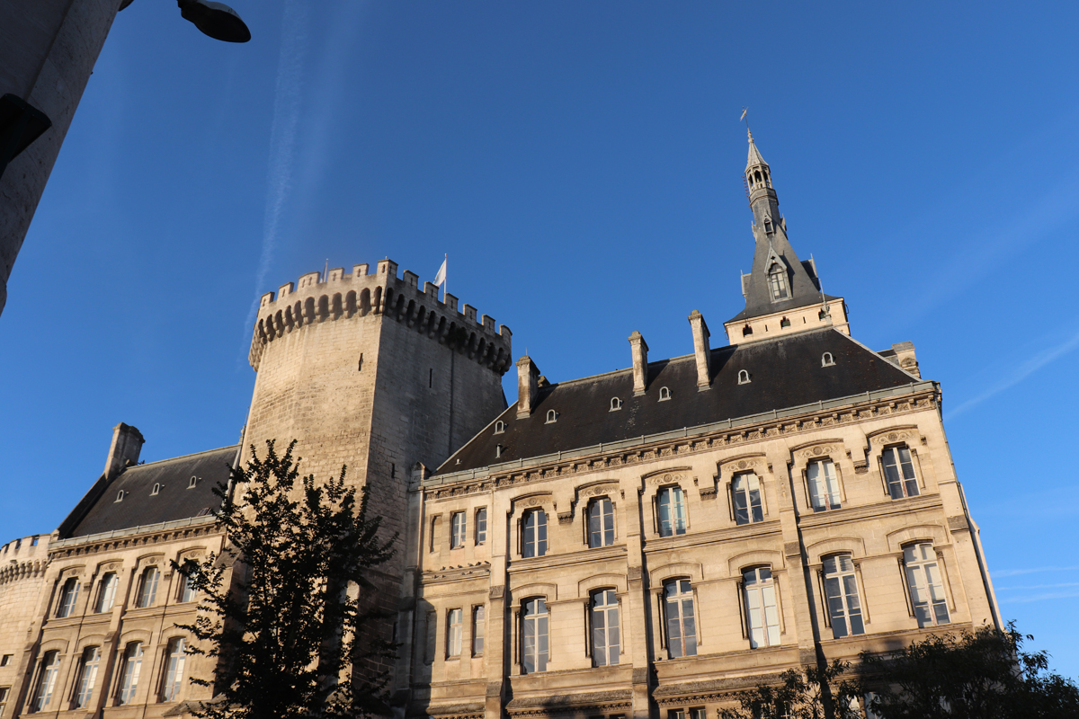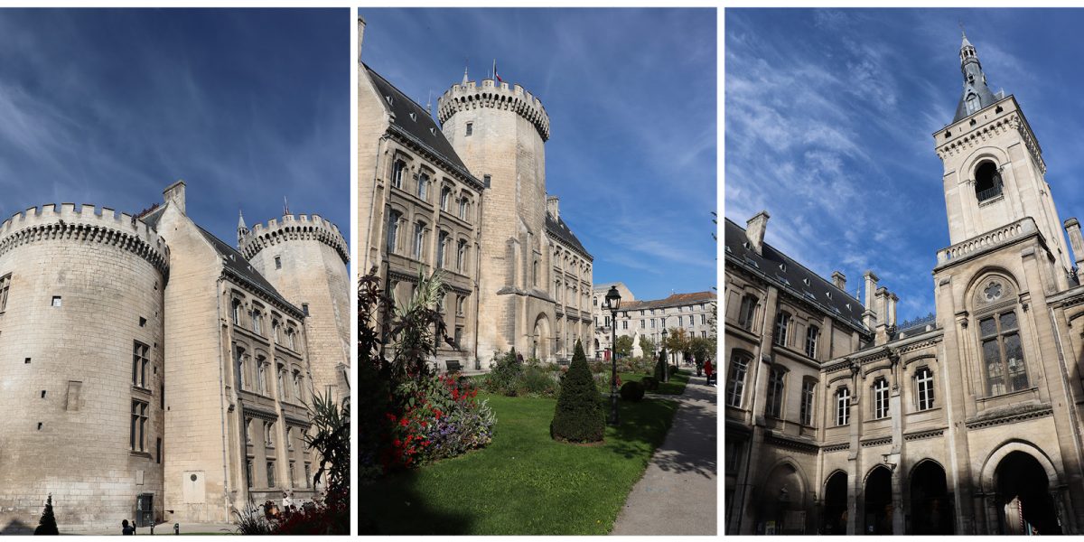 Dessiné par l’architecte Paul Abadie dans un style assez éclectique inspiré en grande partie de l’esthétique médiévale et ponctué de quelques références à la Renaissance ou au Classicisme, il se dresse à l’emplacement de l’ancien château comtal, dont il ne subsiste que le donjon des Lusignan (XIIIe siècle) et la tour des Valois (XVe siècle). Le beffroi, qui surplombe l’ensemble et accentue son caractère monumental, est largement postérieur à ces deux constructions (XIXe siècle).