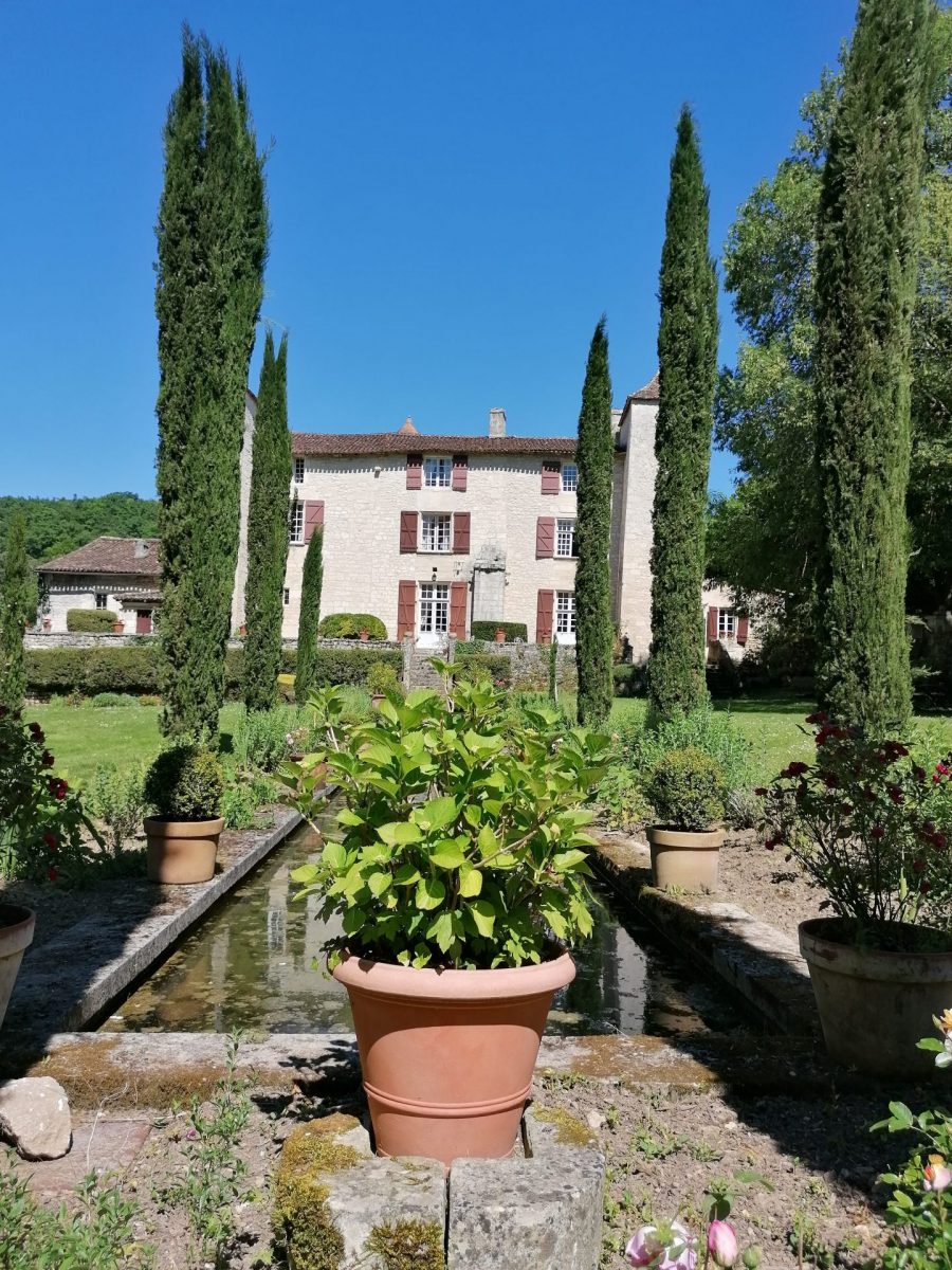 • Le jardin clos : Au pied de la terrasse du logis, un espace ceint de murs en pierres sèches et de buis révèle un canal d’eau bordé de roses et de gauras.