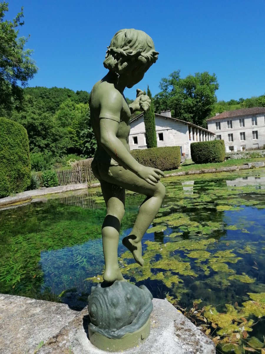 • La pièce d’eau et la résurgence : À l’ouest, une source jaillit d’un entonnoir naturel pour nourrir un bassin où les plantes aquatiques jouent avec les reflets bleus et verts de l’eau cristalline.