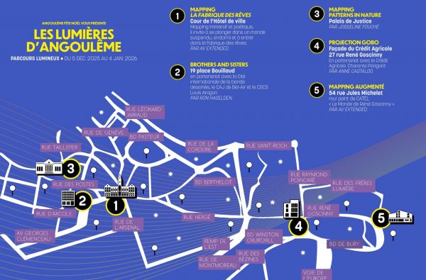 De la cour de l’Hôtel de Ville jusqu’au mur peint Goscinny, les projections animent la fresque et font surgir ses personnages sous un nouveau jour. Le palais de justice s’illumine à son tour, offrant un spectacle éclatant, tandis que la façade du Crédit Agricole du Champ de Mars accueille une création originale signée par une illustratrice locale. Sur la place Bouillaud, les emblématiques « Brothers and Sisters » réapparaissent : des œuvres réalisées par des enfants du monde entier, dont six écoles d’Angoulême, en partenariat avec la CIBDI.