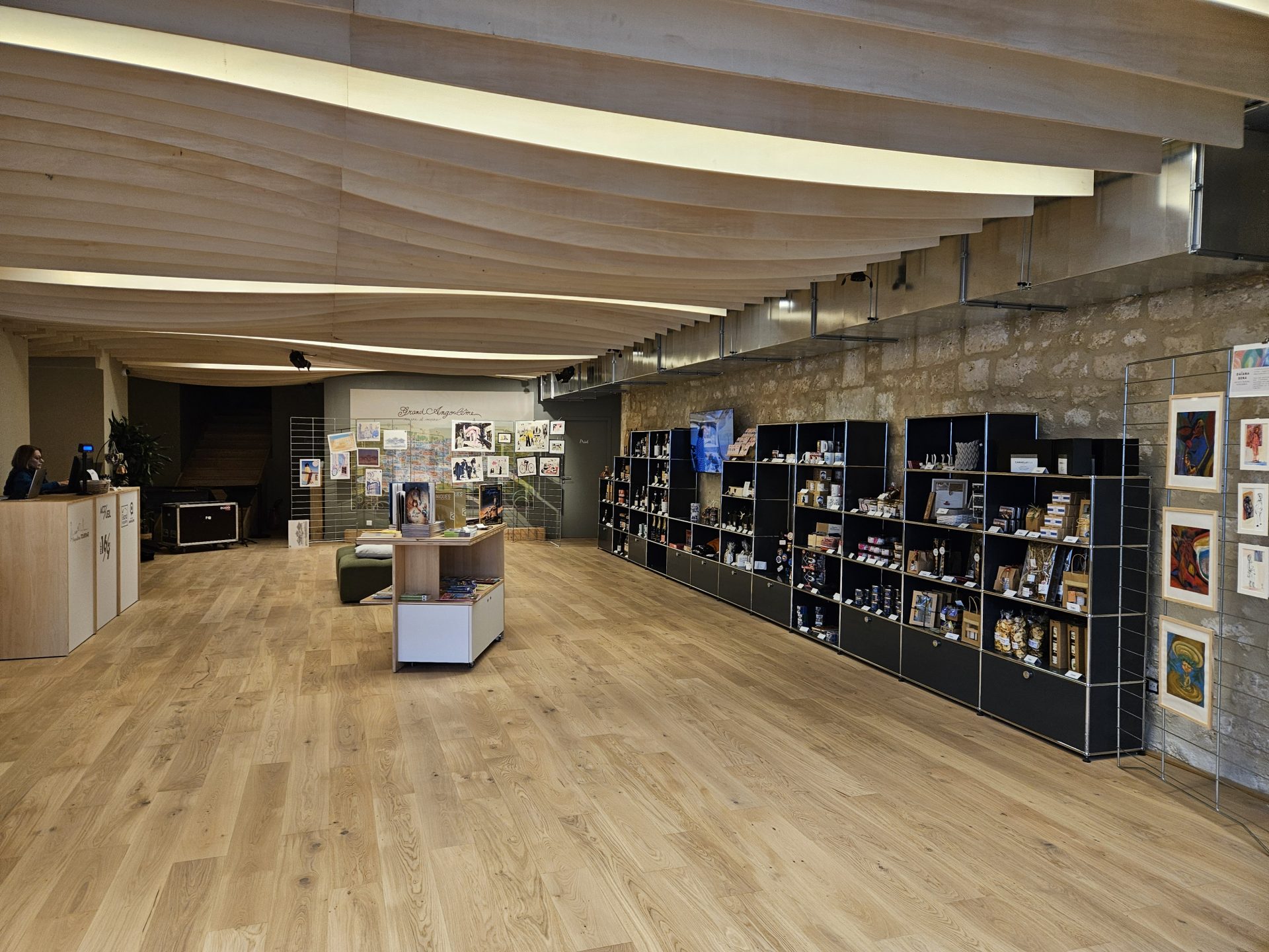 Sous maîtrise d’ouvrage de GrandAngoulême avec le soutien financier de l’État et de l’Union Européenne, ce projet a mobilisé des ressources pour l’achat et la rénovation complète d’un bâti dont la surface totale est de près de 700m² sur 3 niveaux. L’inspiration est née d’une large concertation engagée à l’automne 2024 sous la houlette de la MONA avec les parties-prenantes locales et a été traduite par la maîtrise d’œuvre du Cabinet d’architectes Neyrat-Michelet. Plus de 8 mois de travaux ont été nécessaires à la réhabilitation complète du bâtiment. La plupart des entreprises qui sont intervenues sont basées en Charente. Elles ont su magnifier un immeuble au caractère local grâce à leur engagement et à leurs savoir-faire respectifs. de la construction aux vidéos : sol en parquet, plafond bois, pierres apparentes, vitrines lumineuses mais aussi films sur le territoire, équipement informatique ou connaissance des cycles du cognac, les partenaires ont tous contribué à la richesse des espaces.