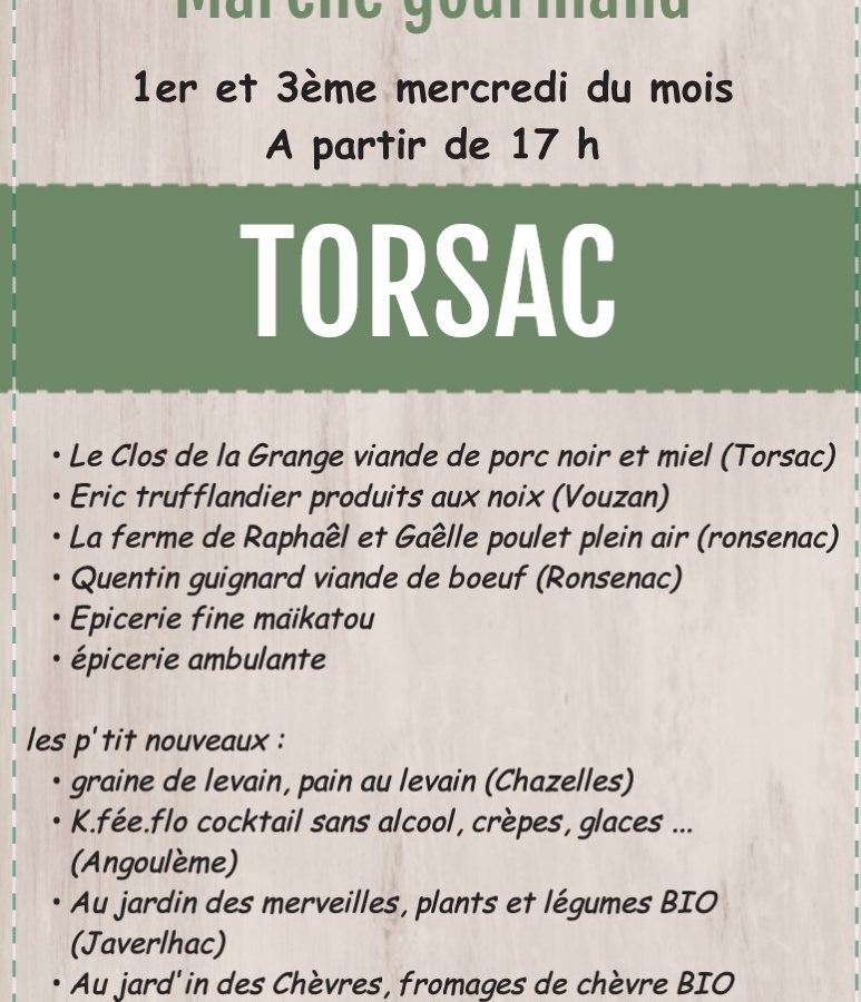 La place Blanche de Torsac accueille un marché d'environ 10 producteurs locaux 2 mercredis par mois. Venez passer un moment convivial et soutenir nos producteurs.