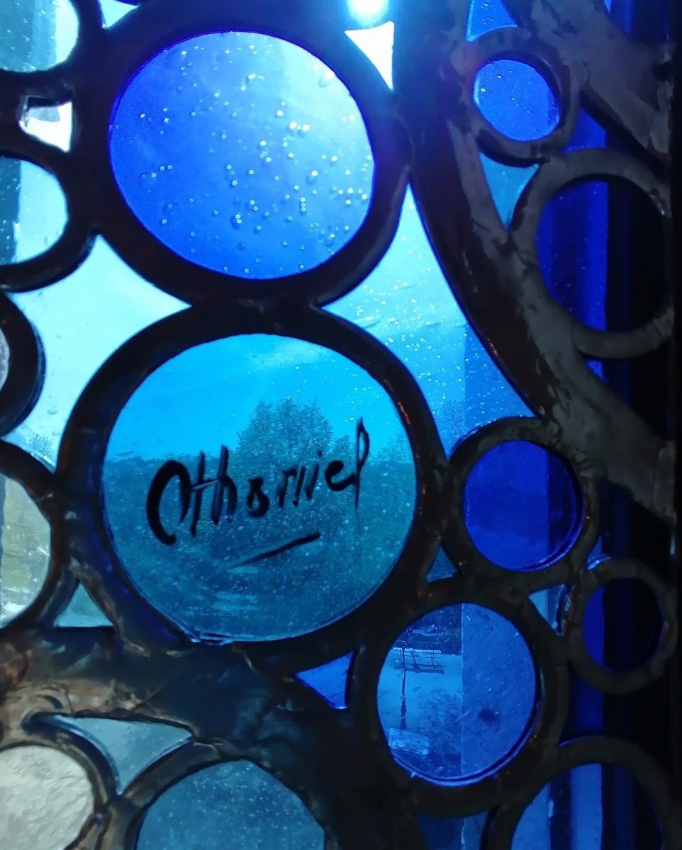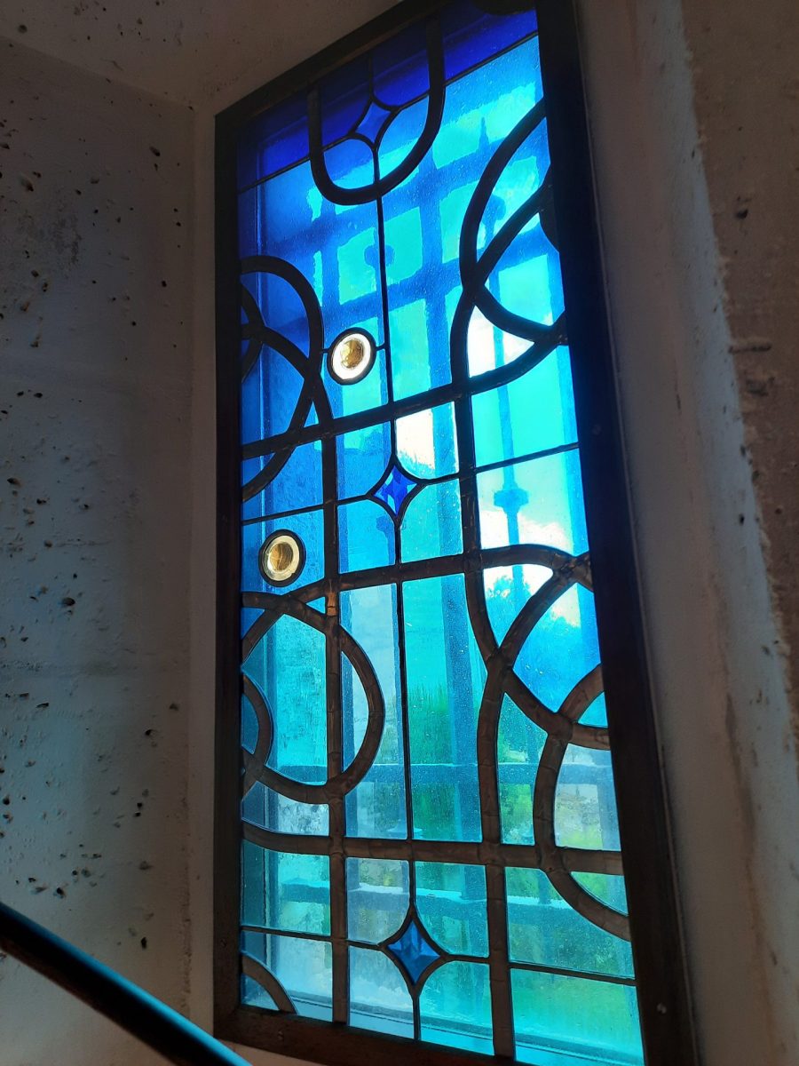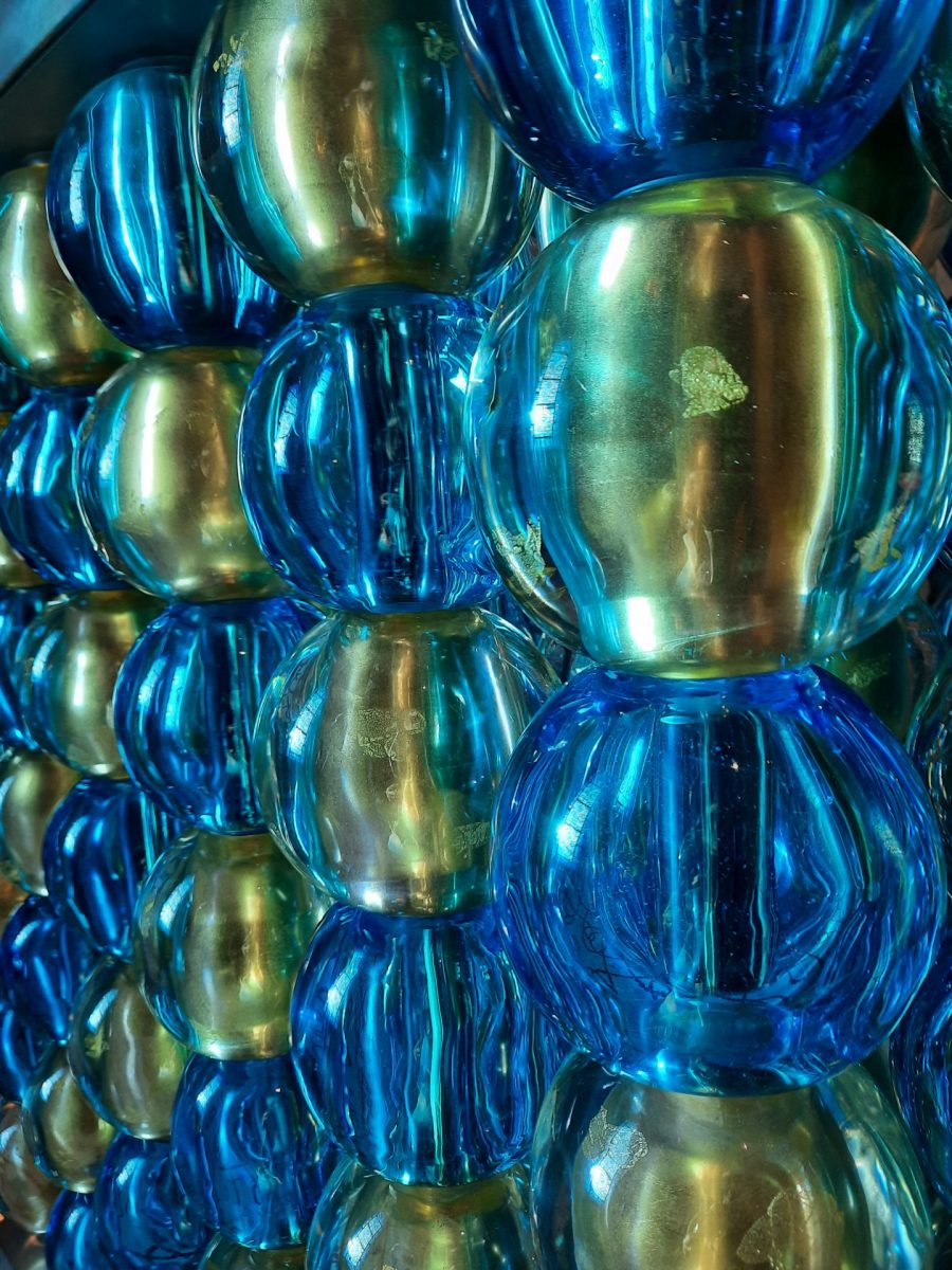 Le verre soufflé coloré, matériau de prédilection de l’artiste qui compose l’essentiel de ses créations aux accents féériques et baroques est ainsi mis au service d’une œuvre spectaculaire. Les vitraux aux tonalités bleu et or diffusent une lumière colorée qui contribue à l’atmosphère onirique des lieux.