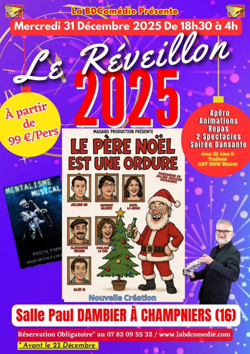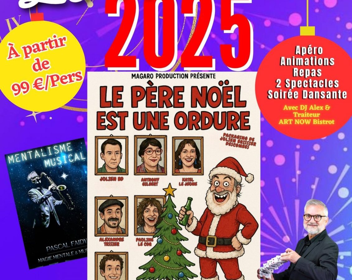 2 Spectacles (Pasal Faydi mentalisme musical et Le Père Noël est une ordure), un repas, et danser jusqu'au bout de la nuit le tout dans une ambiance chaleureuse et conviviale !!! Vite à vos réservations ! Attention places limitées !!!