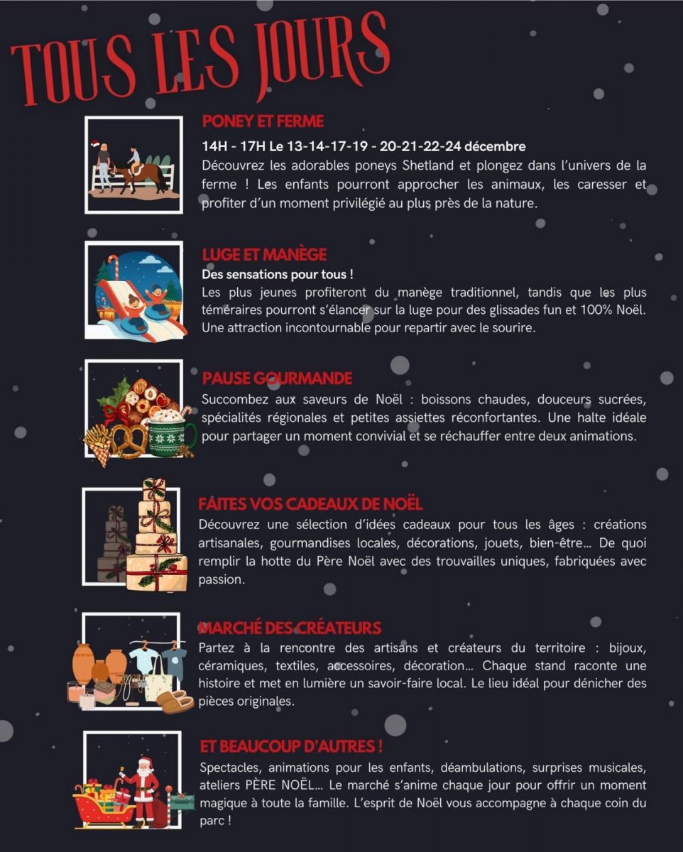Cette année, le Marché de Noël s’agrandit ! Plus de chalets, un espace de restauration plus grand, un coin enfants féérique et plus d’animations et de soirées.