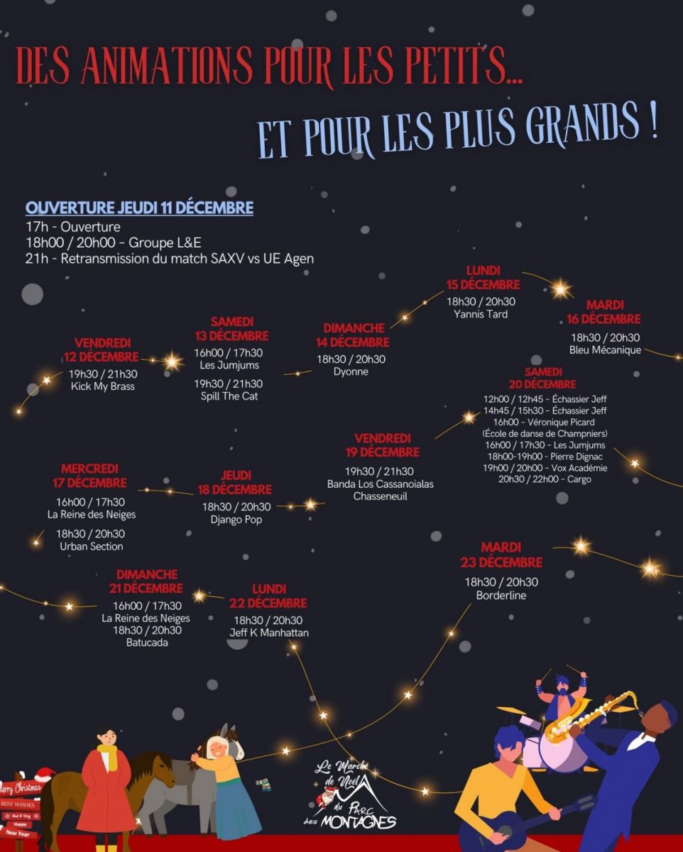 Tous les jeudis, vendredis et samedis, le Marché de Noël vibrera au rythme de soirées, que vous soyez amateur de musique ou simplement en quête de bonne humeur, vous trouverez votre bonheur avec :