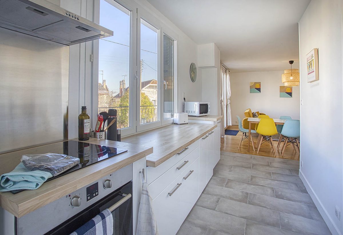 La cuisine entièrement équipée est un atout majeur de cet appartement. Que vous souhaitiez préparer un repas rapide ou cuisiner un festin gastronomique, vous trouverez tout ce dont vous avez besoin à votre disposition. La salle à manger adjacente est parfaite pour partager des repas conviviaux avec vos proches.