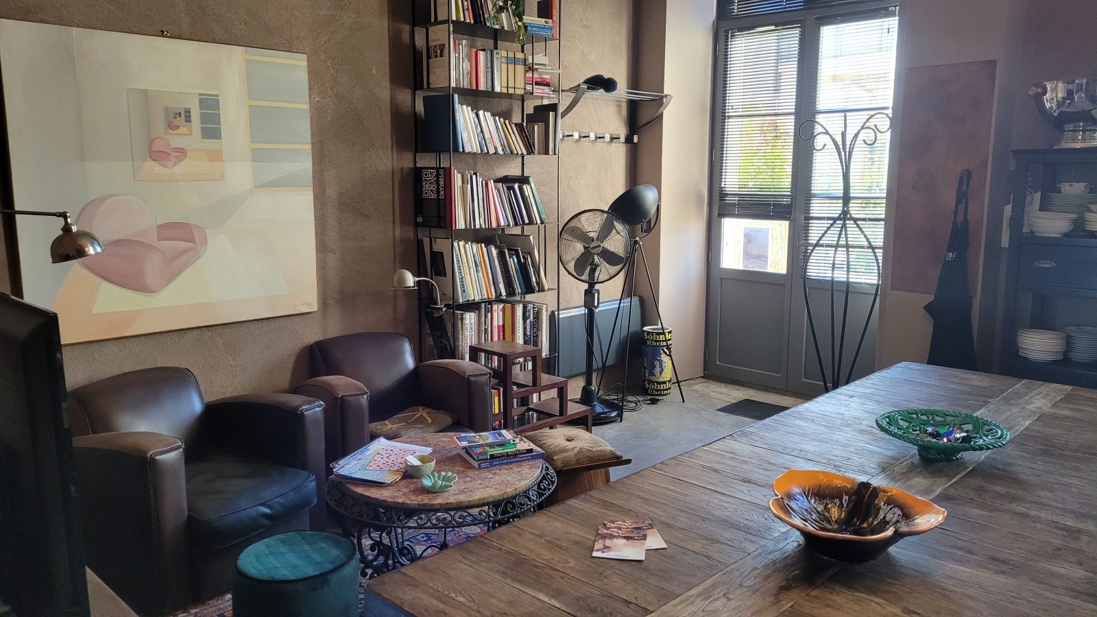 Grand séjour avec espace cuisine. Dans le salon écran de 3.20m x 2m, son quadriphonique, table de mixage, DVD, CD.