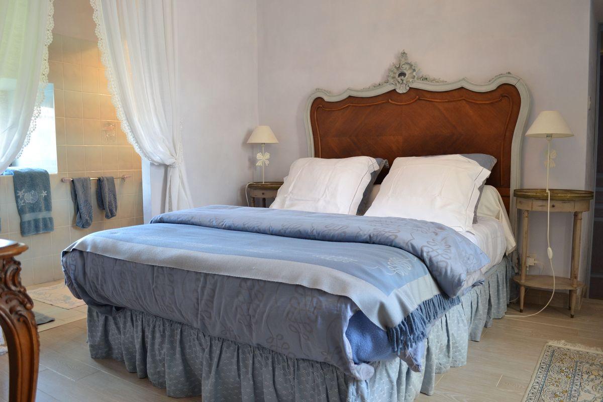 Chambre d'hôtes 3 épis aux murs chaulés en gris bleuté. Lit de 140 et salle d’eau privative, wc privatifs et séparés.