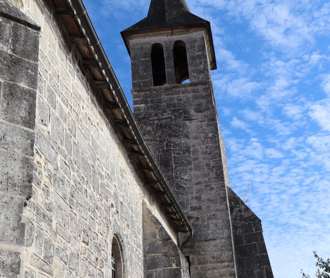 Le clocher carré couronné d'une flèche conique couverte d'ardoise s'élève au sud sur la troisième travée de la nef.