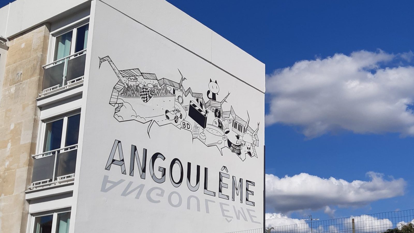 Sur 80 m2, le mur reprend les symboles de la ville : le festival de la BD, Film Francophone, Musiques Métisses et Circuit des remparts.