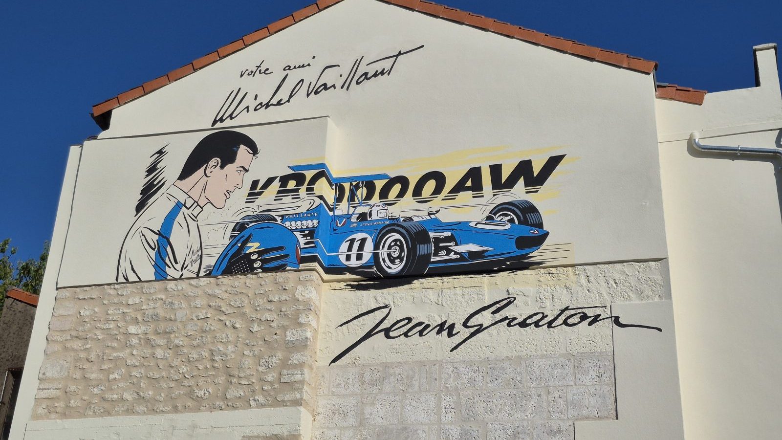 Le dessin, signé Jean Graton, est issu de l’album « de l’huile sur la piste » sorti en 1968 en prépublication dans le journal de Tintin. On y voit le pilote tenant son casque Bell aux couleurs de Michel Vaillant regardant son coéquipier Steve Warson au volant de la Vaillante.