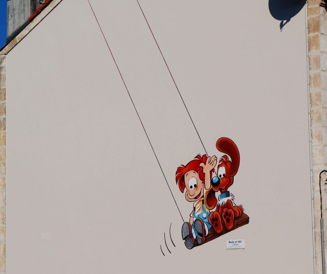 Voici le mur peint créé par Roba, dessinateur belge (1930-2006). Ses deux célèbres personnages sont nés en 1959. Jean Roba a dessiné des dizaines d'albums des aventures de Boule et Bill. Le dessin a été repris par Laurent Veron. Outre les albums de BD, Boule et Bill sont les héros de séries télé.