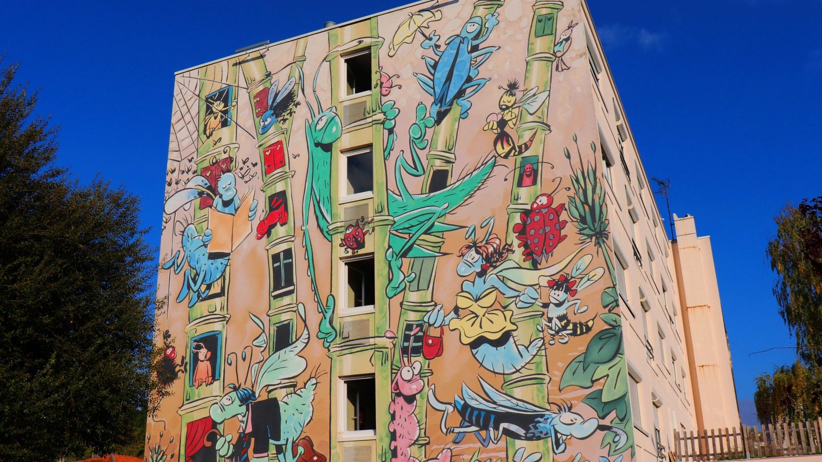 Cette grande fresque colorée nous plonge dans le quotidien trépidant de drôles de petites bêtes au gros nez créées par Florence CESTAC. Ce jardin exubérant fait de bambous géants est situé sur le mur du foyer des jeunes travailleurs.