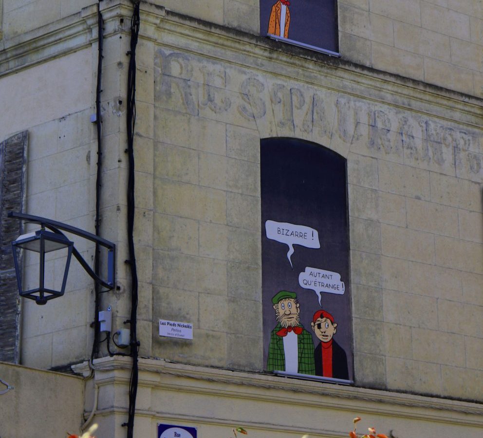 Dessinés dans deux fenêtres en trompe l’œil, vous pouvez reconnaître les célèbres « Pieds Nickelés » : Ribouldingue, Filochard et Croquignol.
