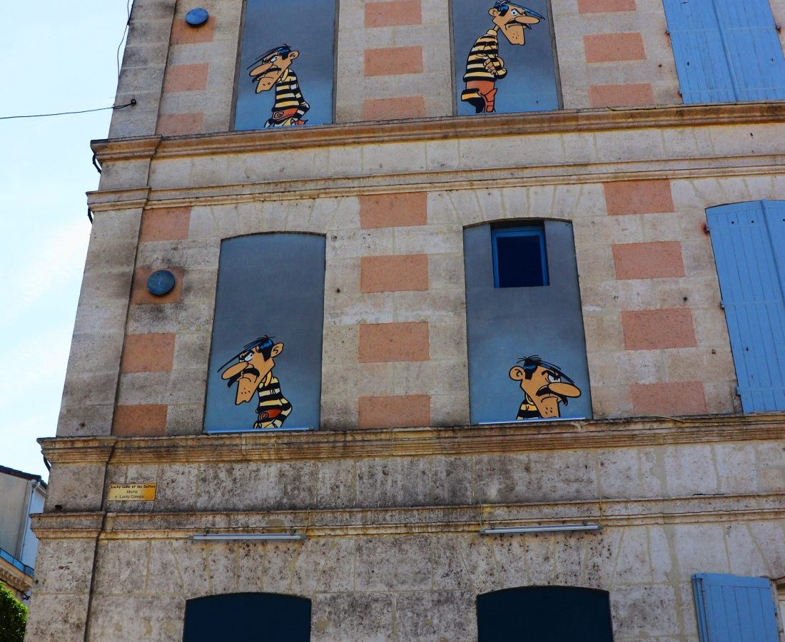 La morphologie du mur en brique et pierre et ses nombreuses fenêtres murées offrent un cadre idéal pour mettre en scène les 4 frères Dalton, Lucky Luke et son fidèle cheval Jolly Jumper.